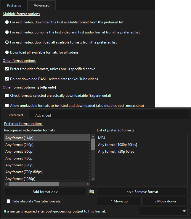 how can i get this to work so that it can download 720/1080 mp4 video formats... i sometimes upload vids to discord and other places so having 720 for lighter filesize will be nice and having 1080 there without me having to do two diff downloads or converting would be nice