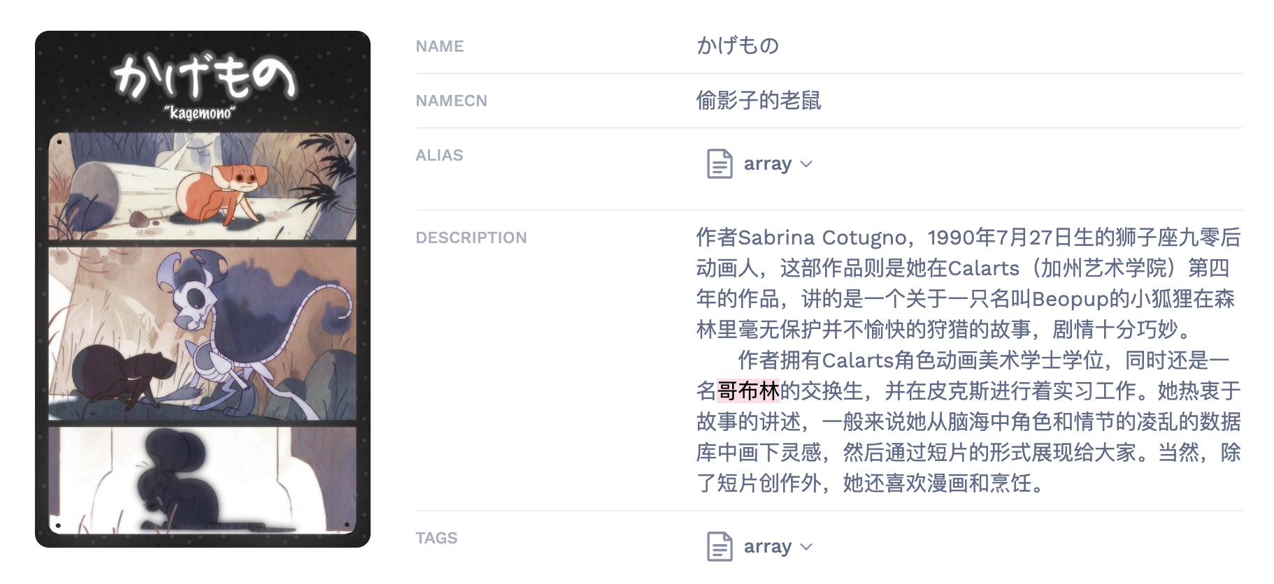 究其原因,summary 虽然是该条目的「简介」,但实际上其内容往往不局限于条目故事内容本身,经常包含对动画创作背景、制作人员、获得奖项等的介绍,这引入了大量毫不相干的关键词。