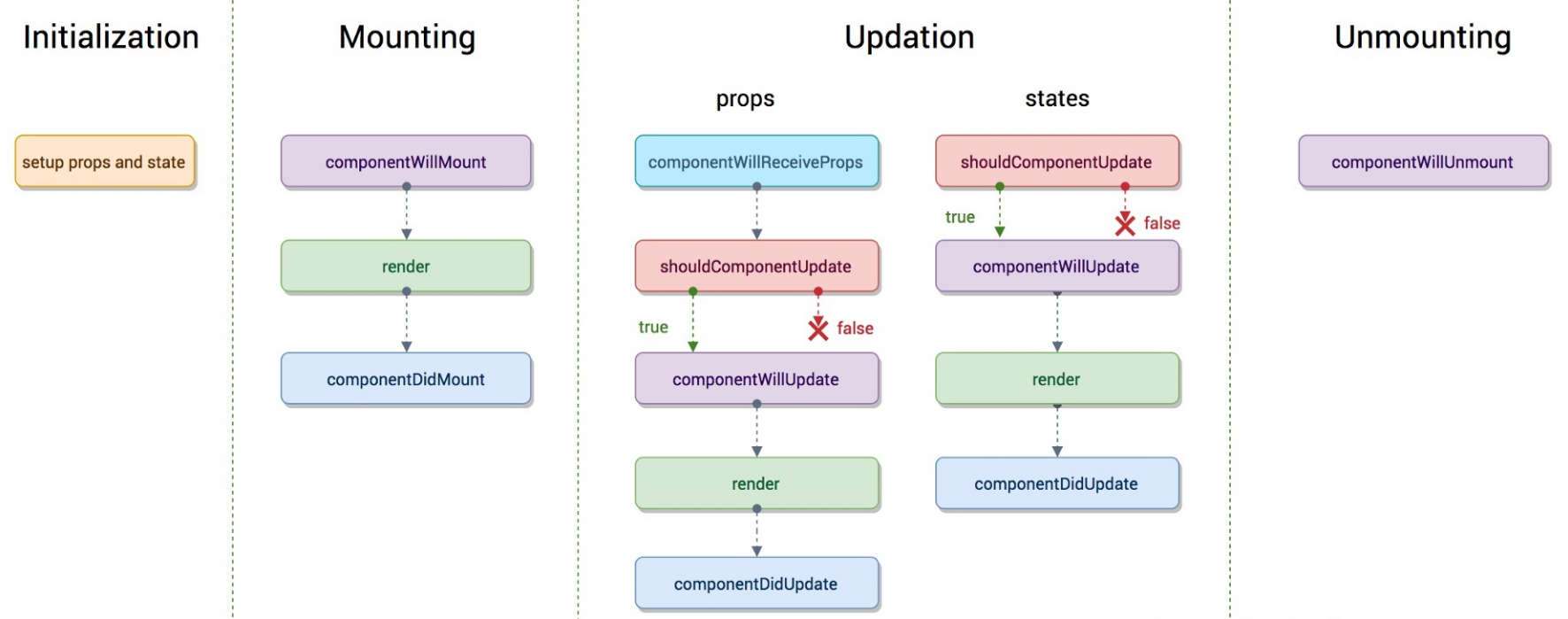- 组件的更新分为两种,一是由父组件触发的更新,二是组件调用自身 setState 触发的更新。父组件触发的更新会额外调用 componentReceiveProps 生命周期,而组件自身触发的更新则直接从 shouldComponentUpdate 开始