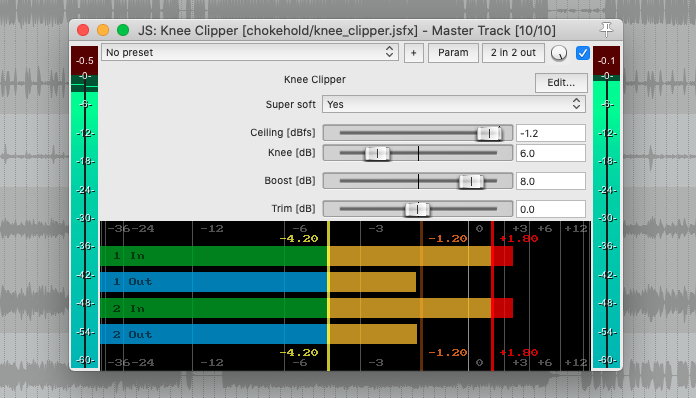 Soft Clipper | Increasingly lowers signal peaks the closer they get to an adjustable ceiling volume, call it warm tube overdrive if you must. Has up to 16x oversampling, DC blocker and optional final (non oversampled) hard clipping stage for true 0 dBfs output. |