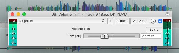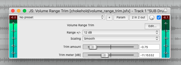 Volume Trim | Simple fader to alter a signal's volume, useful for gain-staging between plugins. Auto-adapts to track's channel count. |