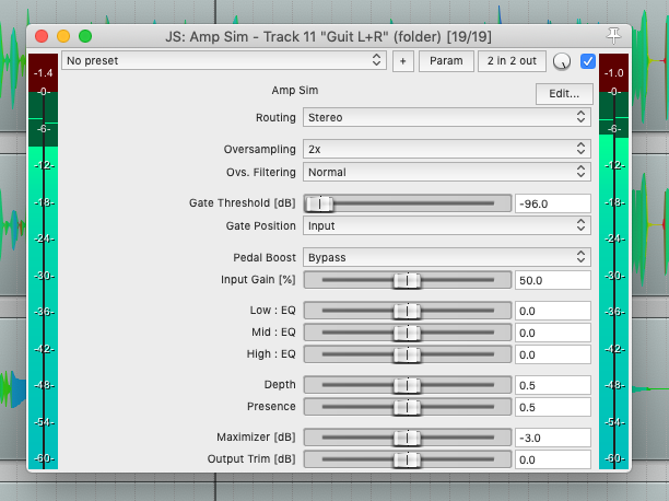 Amp Sim | Guitar and bass amplifier with up to 16x oversampling, mono/stereo routings, pre/post/triggered noise gate, booster pedal function, interactive inter-stage EQ bands, dynamic Depth and Presence bands, and maximizer. |