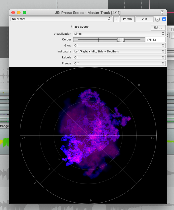 Phase Scope | Visualizes the stereo field of a signal, also commonly known as Goniometer, Vector Scope or Lissajous. Selectable visualization colour and optional freeze-on-pause function. |
