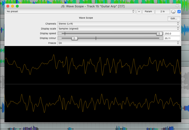 Wave Scope | Waveform display that can visualize various mono/stereo channel streams as Decibels, signed or absolute samples. With fadeable colours and freeze-on-pause function. |