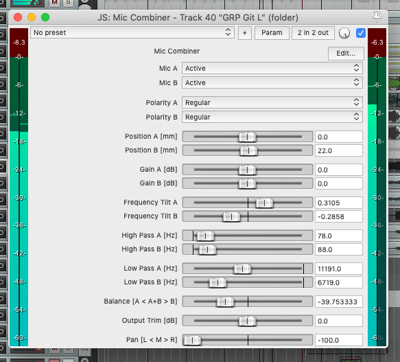 Mic Combiner | Utility to facilitate the process of merging two mono microphone signals into one. Processes each microphone signal individually, allows to set a balance/mix between both microphones, and sums them to mono. Can adjust timing between signals. |