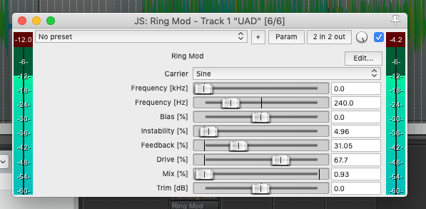 Ring Mod | Multiplies the input signal with a carrier signal, which can lead to all sorts of warbly modulation and distortion effects. |