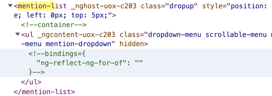 <input [mentionConfig]="mentionConfig" [mentionListTemplate]="mentionTemplate" [mention]="httpItems | async" (searchTerm)="mentionSearch($event)">