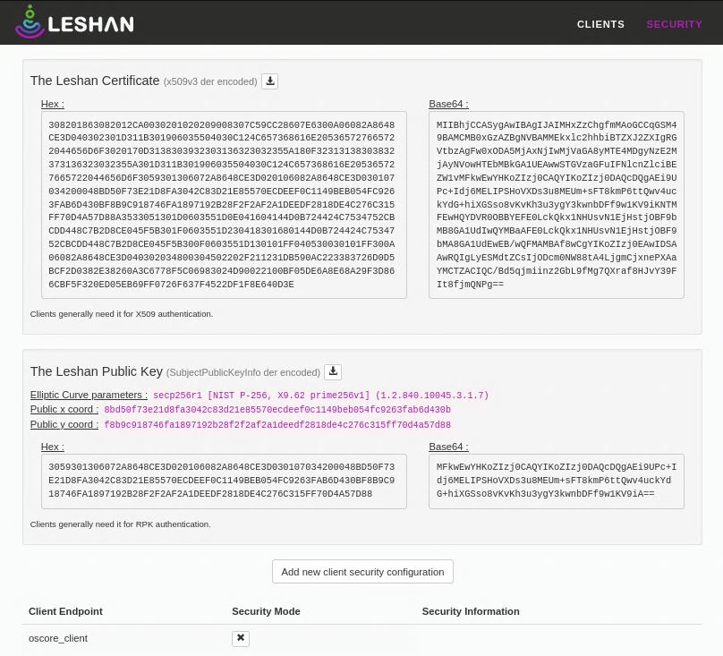 After the client registration, the client account on the server's 'Security' tab contains 'Client Endpoint' field only. 'Security Mode' and 'Security Information' fields are disappeared. leshan_security_tab