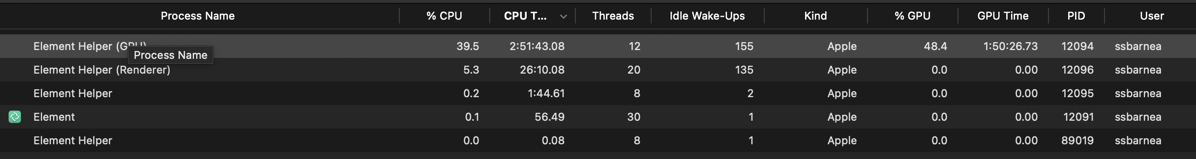 I observed serious CPU usage from the "Element Helper (GPU)" (1.10.10) thread on apple silicon even when the app is only on background. It drains the battery. Here is a sample took on it https://sbarnea.com/ss/Sample-of-Element-Helper-GPU-.txt