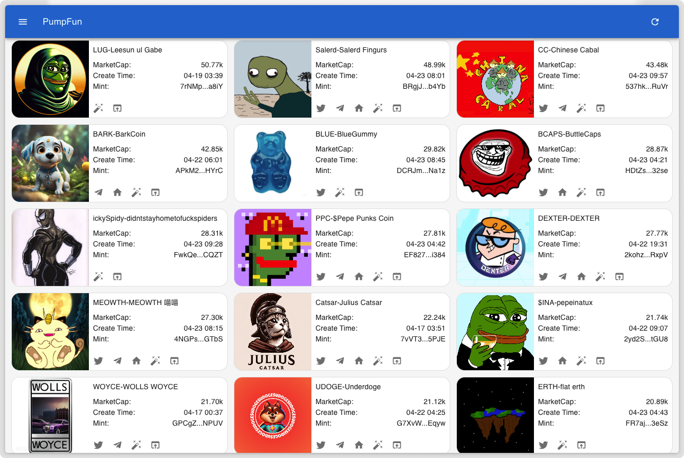 - Show social links(Twitter、Telegram、Website、Pumpfun link)