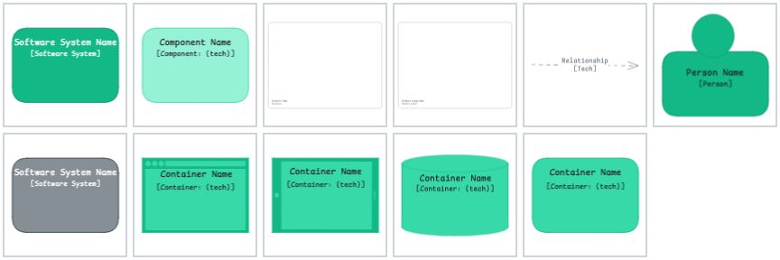 Items: Software System, Component, Container Frame, Software System Frame, Relationship, Person, Software System External, Container, Container Web, Container DB, Container