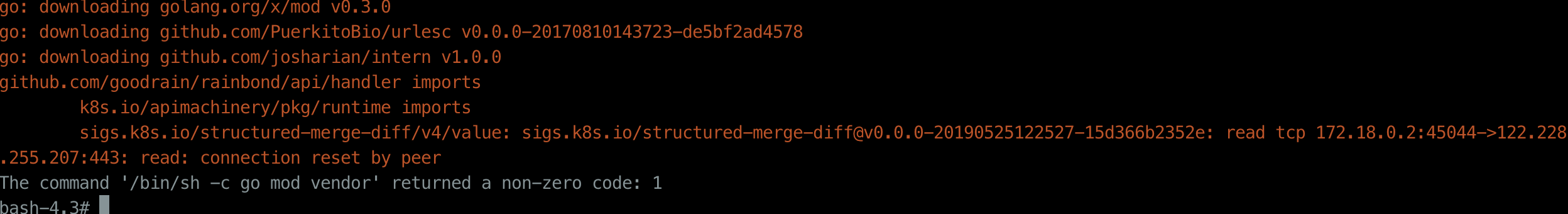 The command '/bin/sh -c go mod vendor' returned a non-zero code: 1