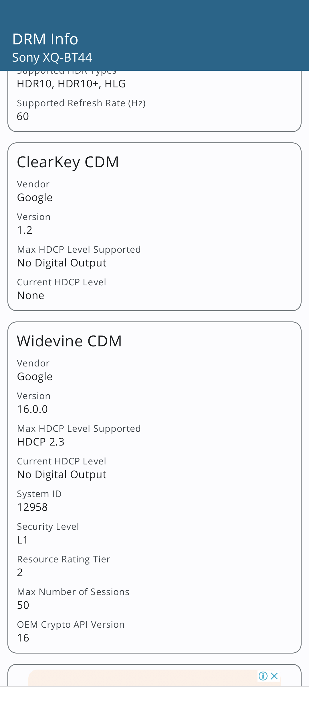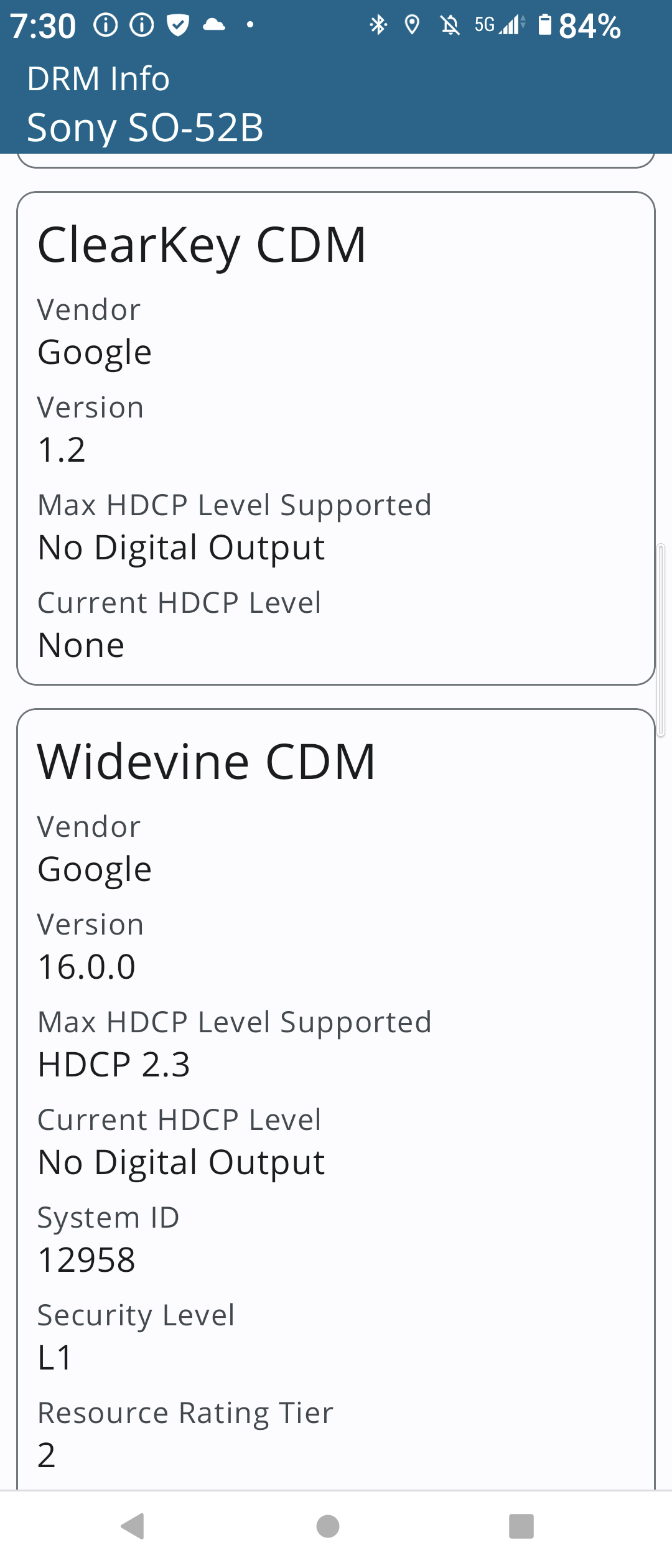 The same error is occurring on the XQ-BT44(Android 12) and SO-52B(Android 12), and a user provided me with the information on the DRM info app, which we will share.