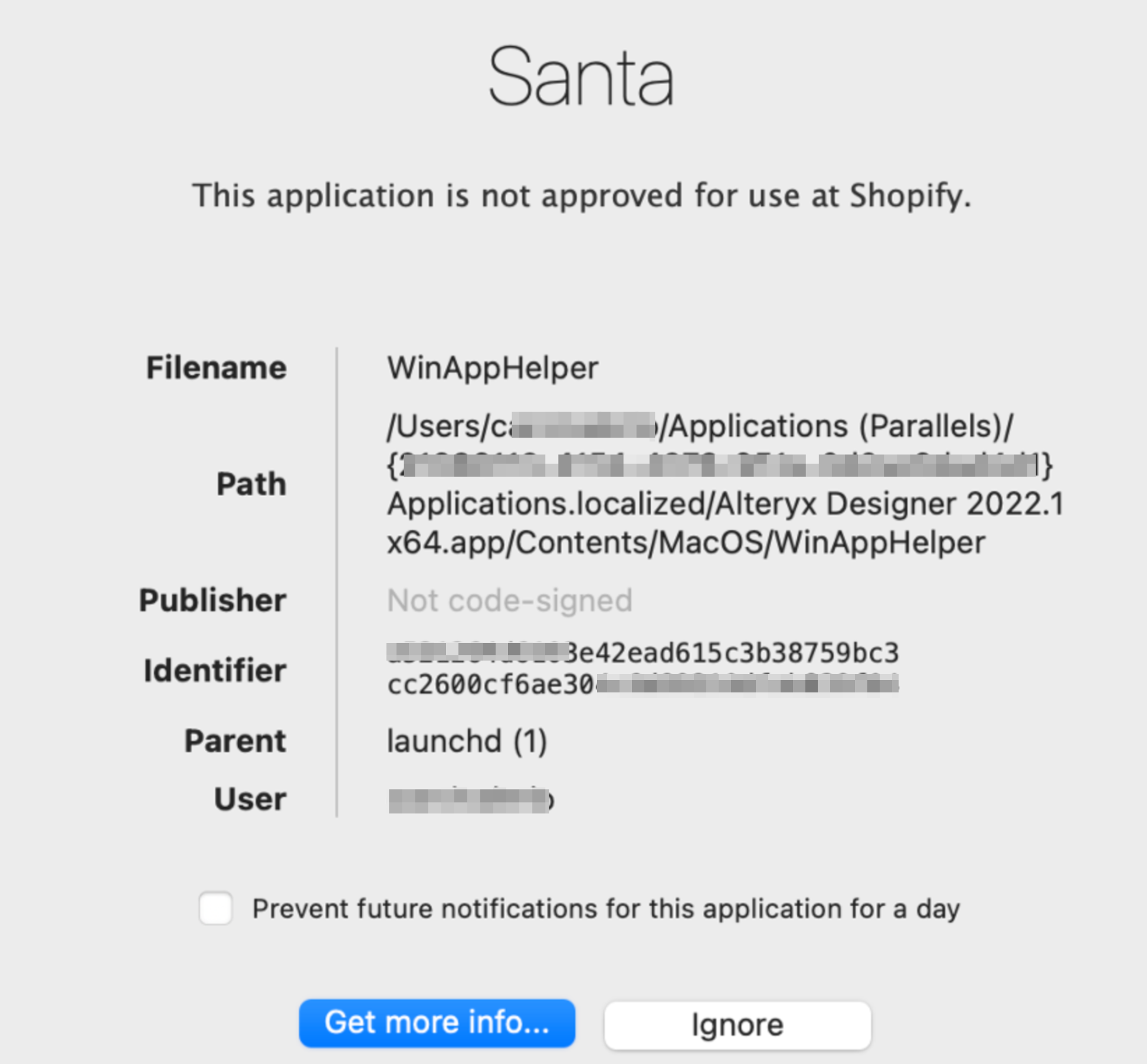@andyury so looking at that WinAppHelper screenshot. The application is unsigned and depending on your configuration and Santa rules this is working as intended.