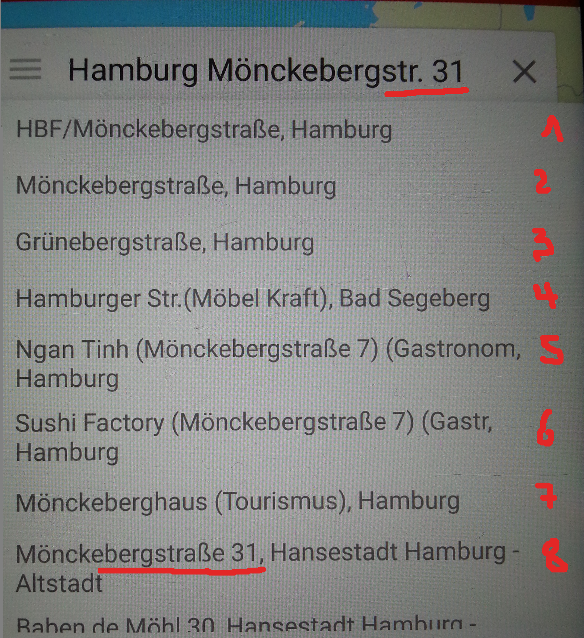 When I search for a specific street, in this example just 'Mönckebergstr. 31' (in Hamburg, Germany), as seen, the app suggest several close locations, but also unrelated stuff. Moreover, the app suggest the target, but ranks it to the 8th place of the list. In between are locations which might interest me, but I don't expext them to be previous to the actual target I typed into the search bar.