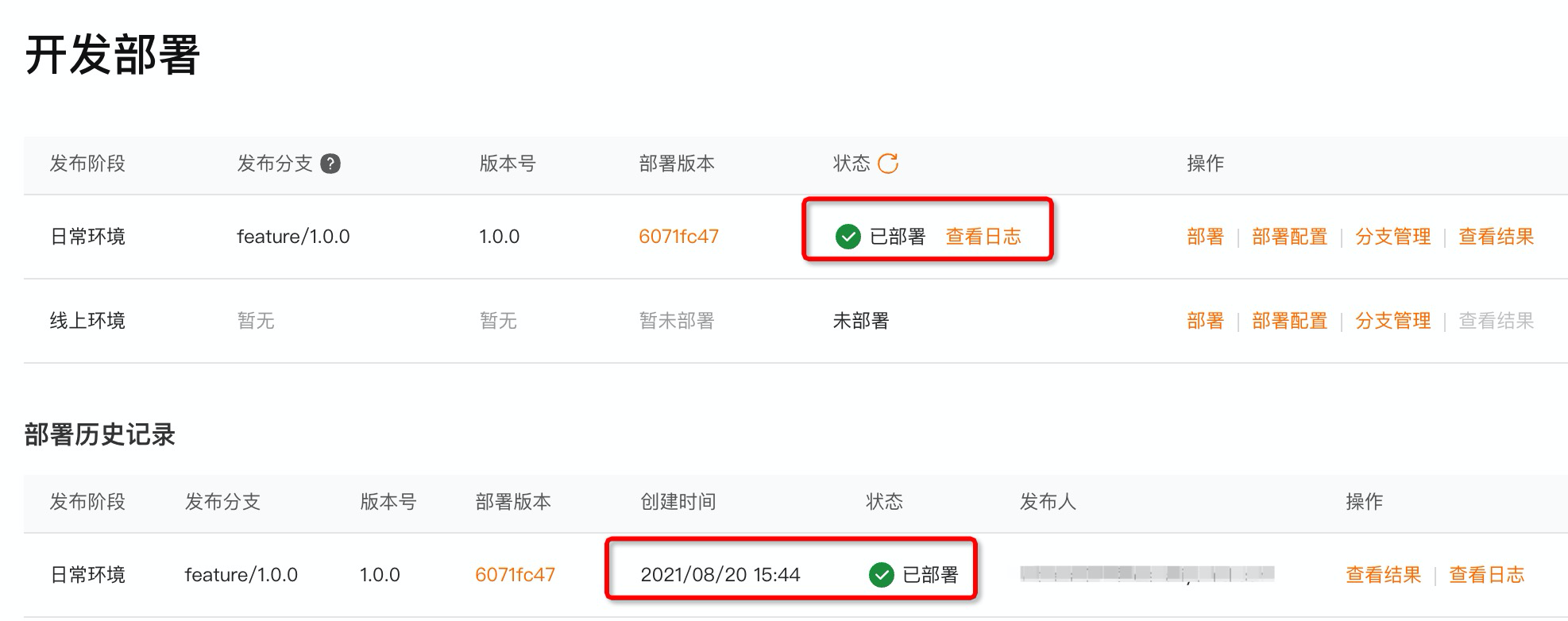 依次点击日常环境的「部署」「确定」,即可启动发布流程: