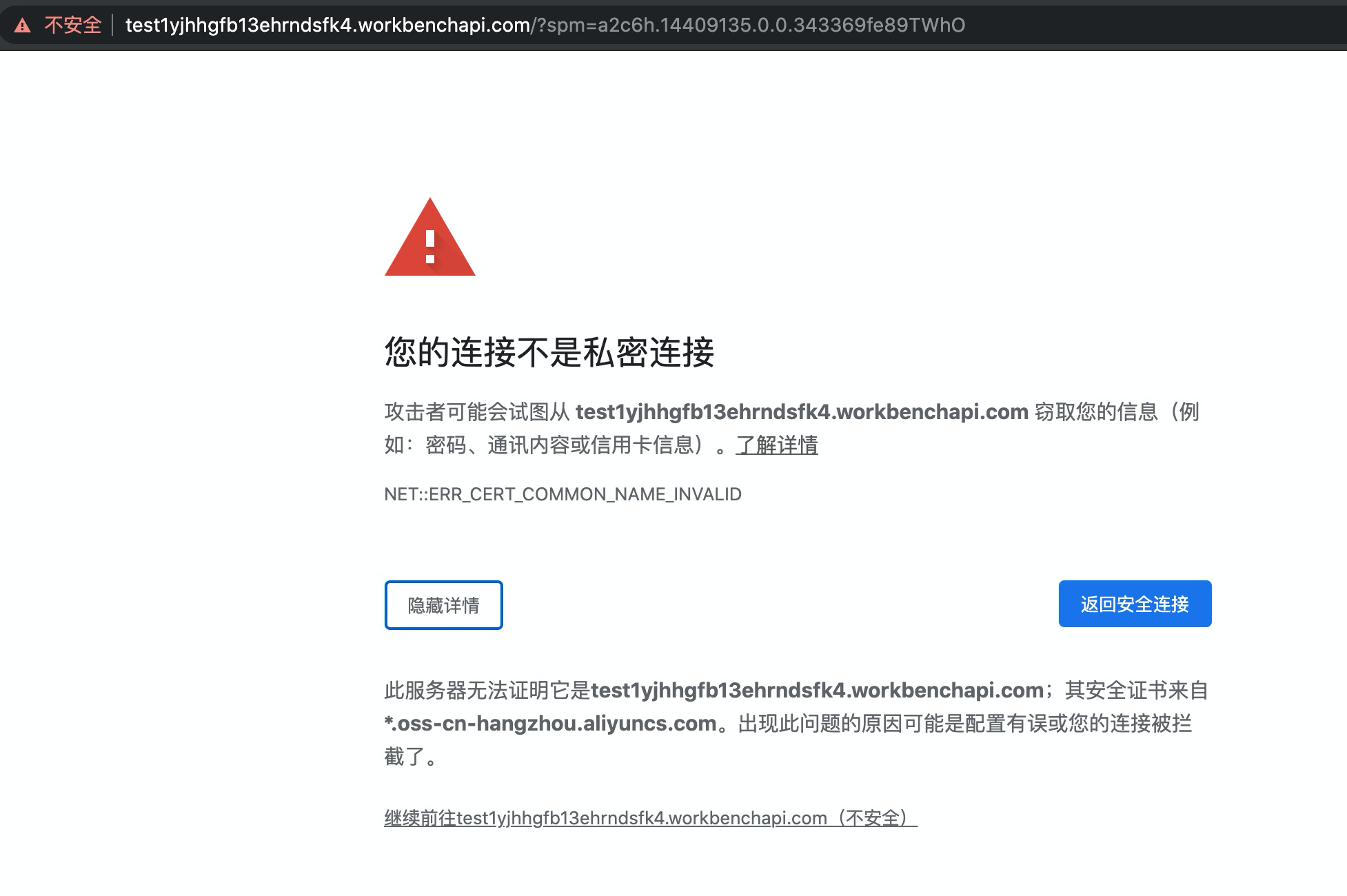 如果测试域名访问时出现类似以下情况,请点击「高级」-「继续访问」。这是因为临时测试域名并未提供完整的证书,仅供您临时测试使用。如果需要发布为长期的正式网站,请看下一步。