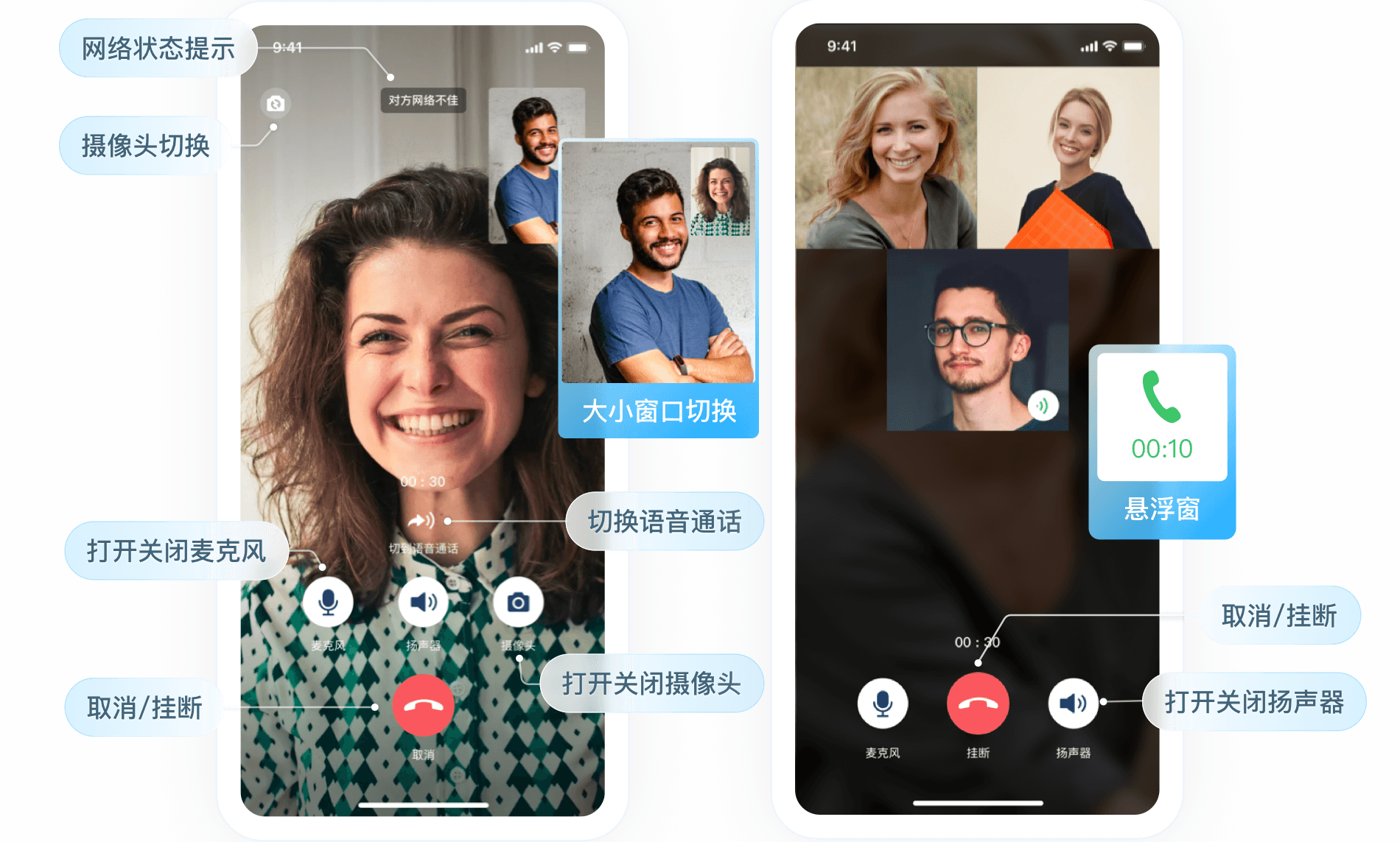 - 接入方便:提供带 UI 的开源组件,节省90%开发时间,快速上线音视频通话应用。