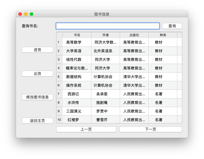 - 智能补全,当图书名称、作者、出版社在数据库中存在(即书店中存在这种书)时智能补全图书种类与销售价格,当图书名称、作者、出版社在数据库中不存在时(即书店从未进过这本书)补全图书种类、销售价格与购入数目由用户输入