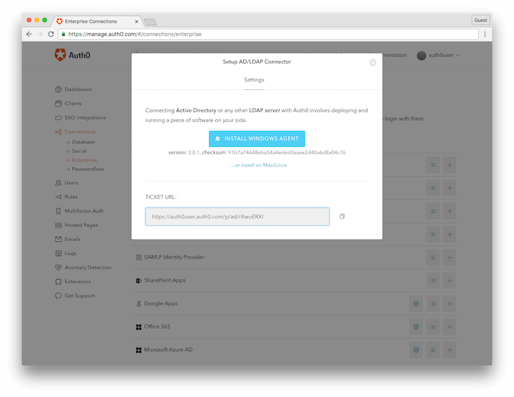 Save the configuration. You are done on the Auth0 side! You will then be prompted to download the AD/LDAP Connector on your machine.