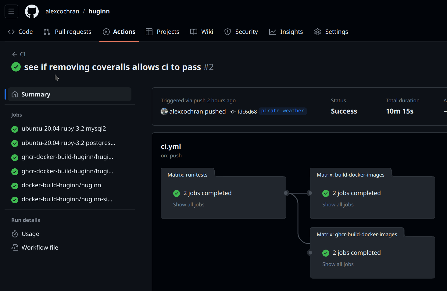 Thanks @cantino. I commented out Coveralls from the GitHub CI config and everything seems to work: