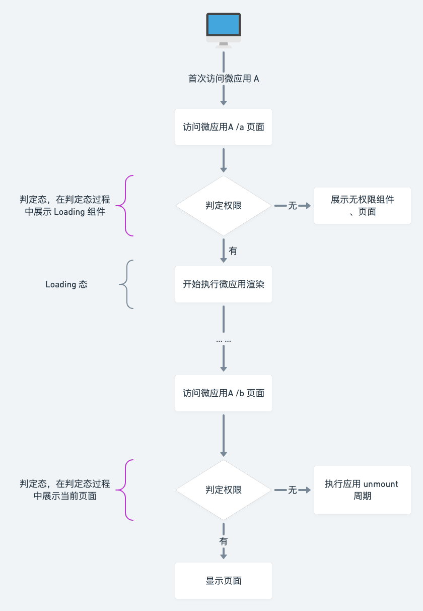 结论: 在主应用集中式地处理权限,以及过渡状态。