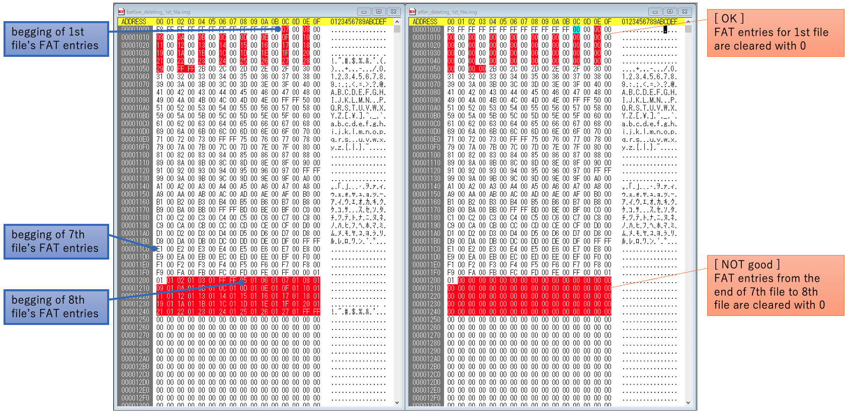 There are 8 files in the USB memory. When I delete any one of the 1st to 6th files, the 7th and 8th files get corrupted (FAT entries are set to 0). I will attach the difference between the FAT area before and after the deletion. (diff_before_and_after_deletion)