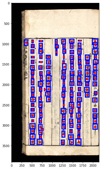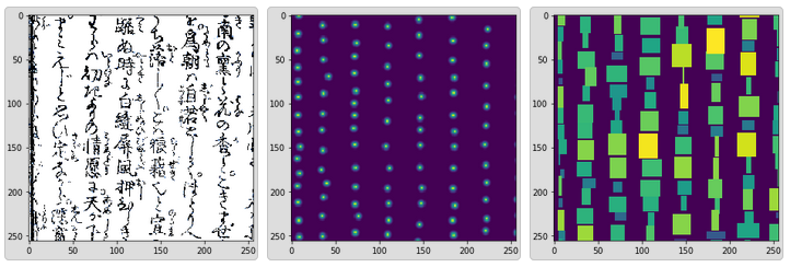 From the beginning @ollieperree was using a 2-stage approach. Our approach to detection was directly inspired by K_mat's kernel, with the main takeaway being the idea of predicting a heatmap showing the centers of characters. Initially, we used a U-Net with a resnet18 backbone to predict a heatmap consisting of ellipses placed at the centers of characters, with the radii proportional to the width and height of the bounding box, with the input to the model being a 1024x1024 pixel crop of the page resized to 256x256 pixels. Predictions for the centers were then obtained by picking the local maxima (note that the width and height of the bounding box were not predicted). Performance was improved by changing the ellipses to circles of constant radius.