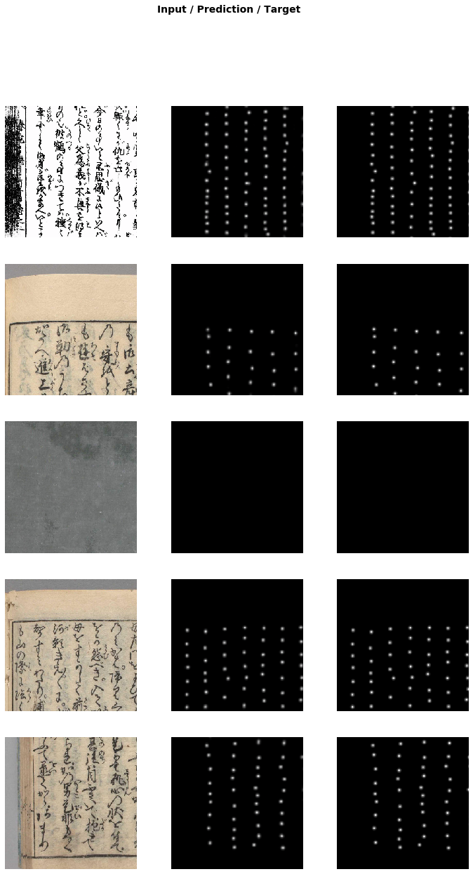 One issue with using 1024x1024 crops of the page as the input were "artifacts" around the edges of the input. We tried a few things to try to counteract this, such as moving the sliding window over the page with a stride less than 1024x1024, then removing duplicate predictions by detecting when two predicted points of the same class were within a certain distance of each other. However, these did not give an improvement on the LB - we think that tuning parameters for these methods on the validation set, as well as the parameters for selecting maxima in the heatmap, might have caused us to "overfit".