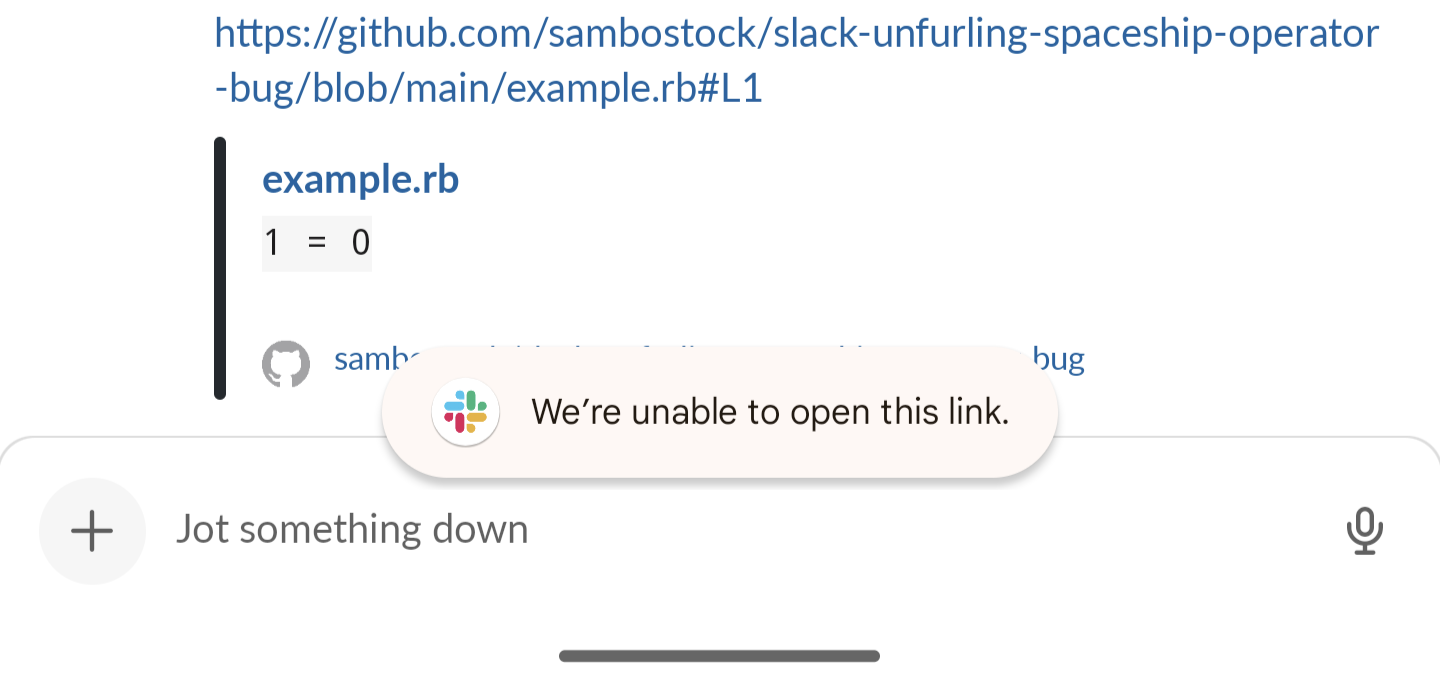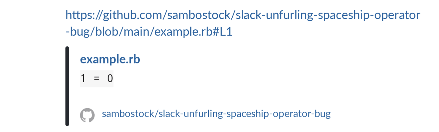 - Visit https://github.com/sambostock/slack-unfurling-spaceship-operator-bug/blob/main/example.rb#L1 and note the file's contents