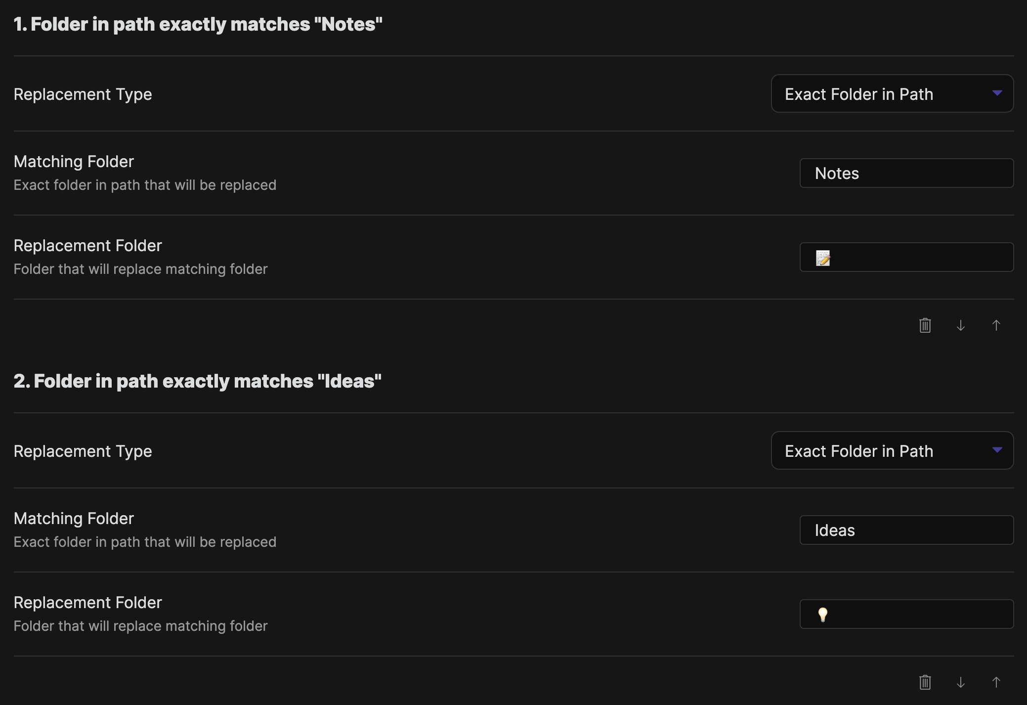 You can replace an exact match of one folder in the path with an alternate folder. For example, here we replace "Notes" with "📝" and "Ideas" with "💡".