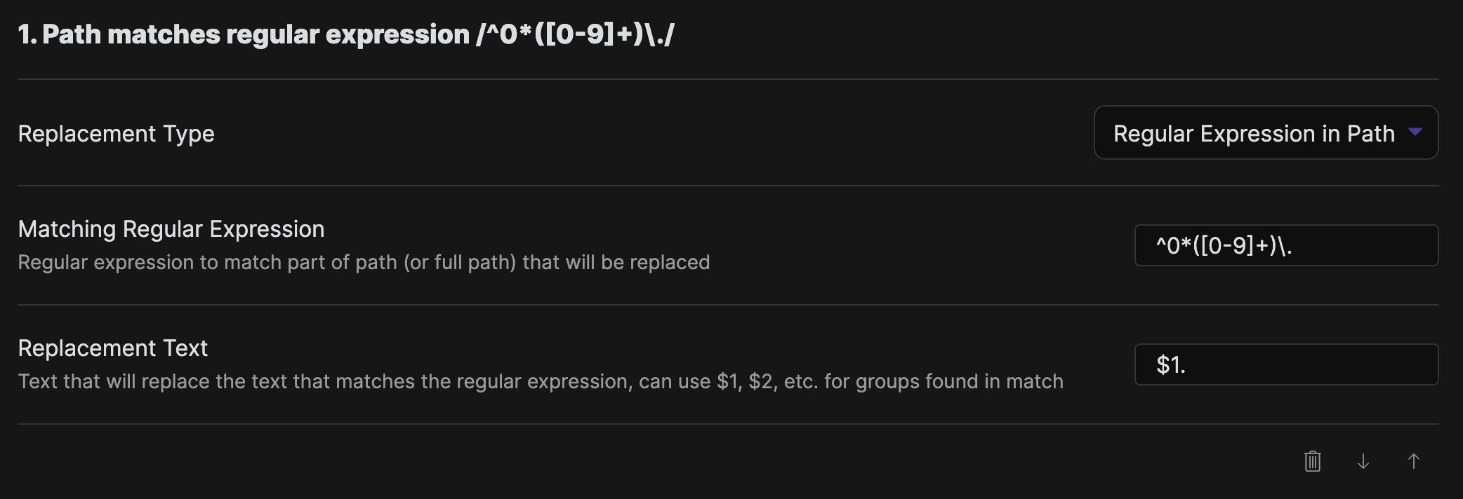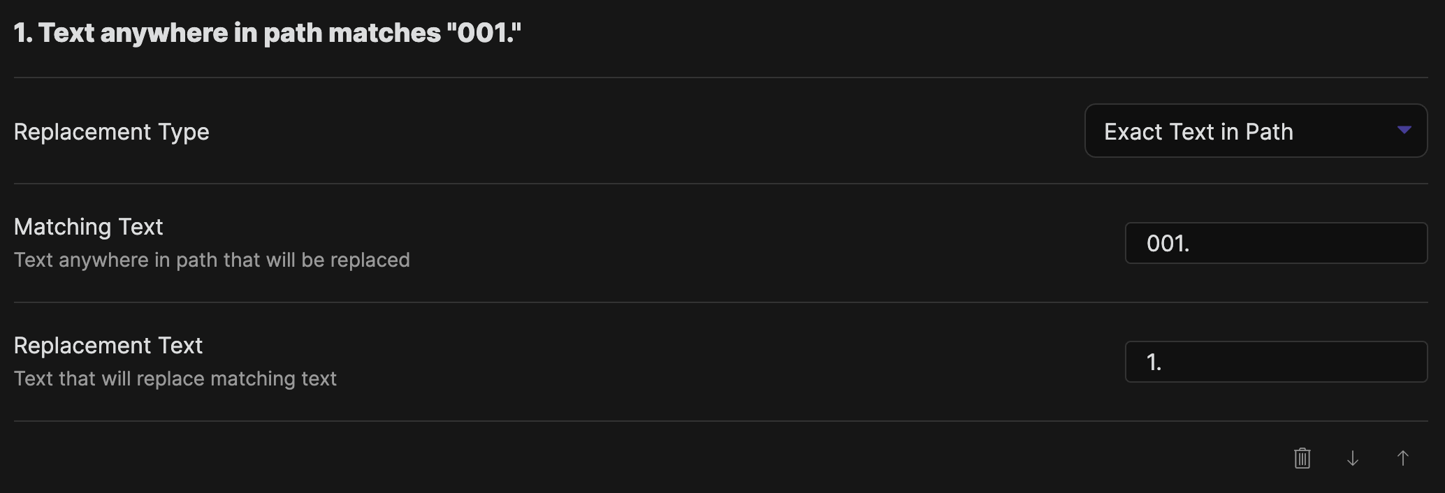 You can replace text anywhere in the path with alternate text. For example, here we replace "001." with "1.".