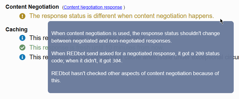 @mholt Most warnings that REDbot reported as shown in here have been fixed (checked just now), except for the "Vary" one. "Vary" header is still not being sent for requests...