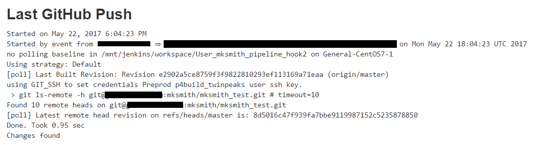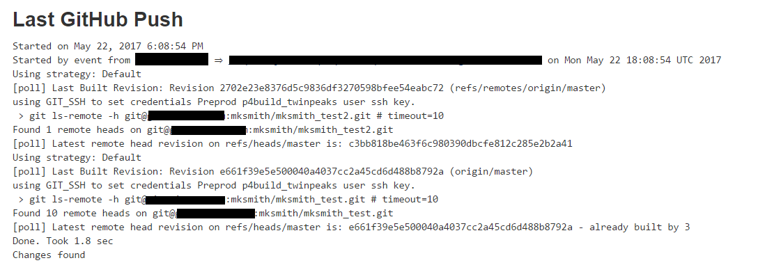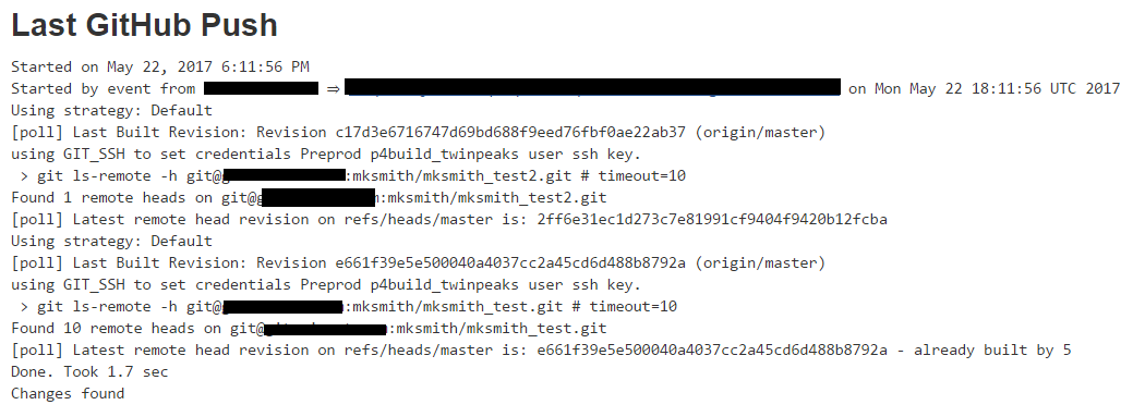 stage("Prep") { node("general-centos7") { checkout(changelog: false, poll: false, scm: [$class: "GitSCM", branches: [[name: "master"]], userRemoteConfigs: [[credentialsId: "ssh_key", url: "[email protected]:mksmith/mksmith_test2.git"]]]) checkout(changelog: true, poll: true, scm: [$class: "GitSCM", branches: [[name: "master"]], userRemoteConfigs: [[credentialsId: "ssh_key", url: "[email protected]:mksmith/mksmith_test.git"]]]) } }With this setup, I ran a build manually (in order to initialize the polling baselines) and then made updates to each repo. Hooks behaved as expected