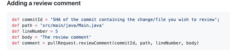 Getting `org.eclipse.egit.github.core.client.RequestException: Validation Failed (422): line required and an integer greater than zero` The method documentation has a lineNumber parameter (https://github.com/jenkinsci/pipeline-github-plugin#adding-a-review-comment)