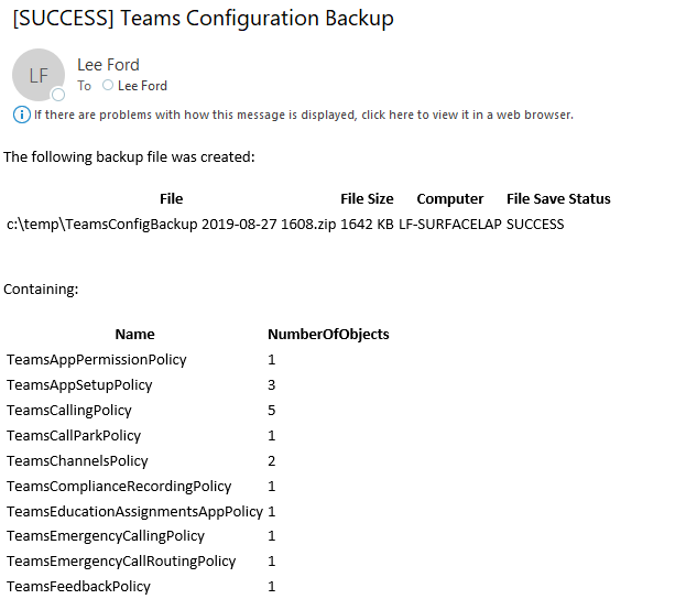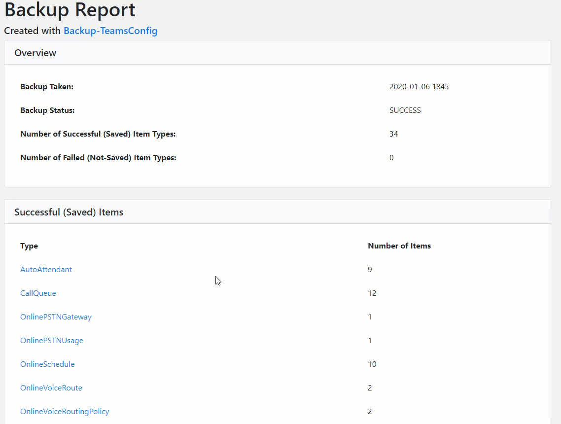Note: The script will backup Teams policies or configuration by using a wildcard. If a new type of policy or configuration appears e.g. "Get-CSTeamsExamplePolicy" it will automatically get included within the backup.