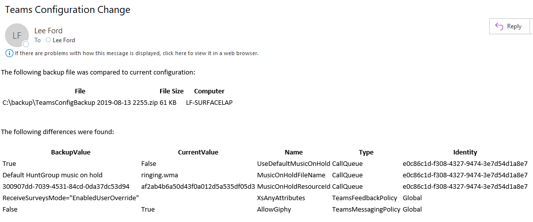 The example Flow "BackupTeamsConfig(Comparison)Flow.zip" found with the script can be imported in to Flow to illustrate how this can be used (in this case send an email):