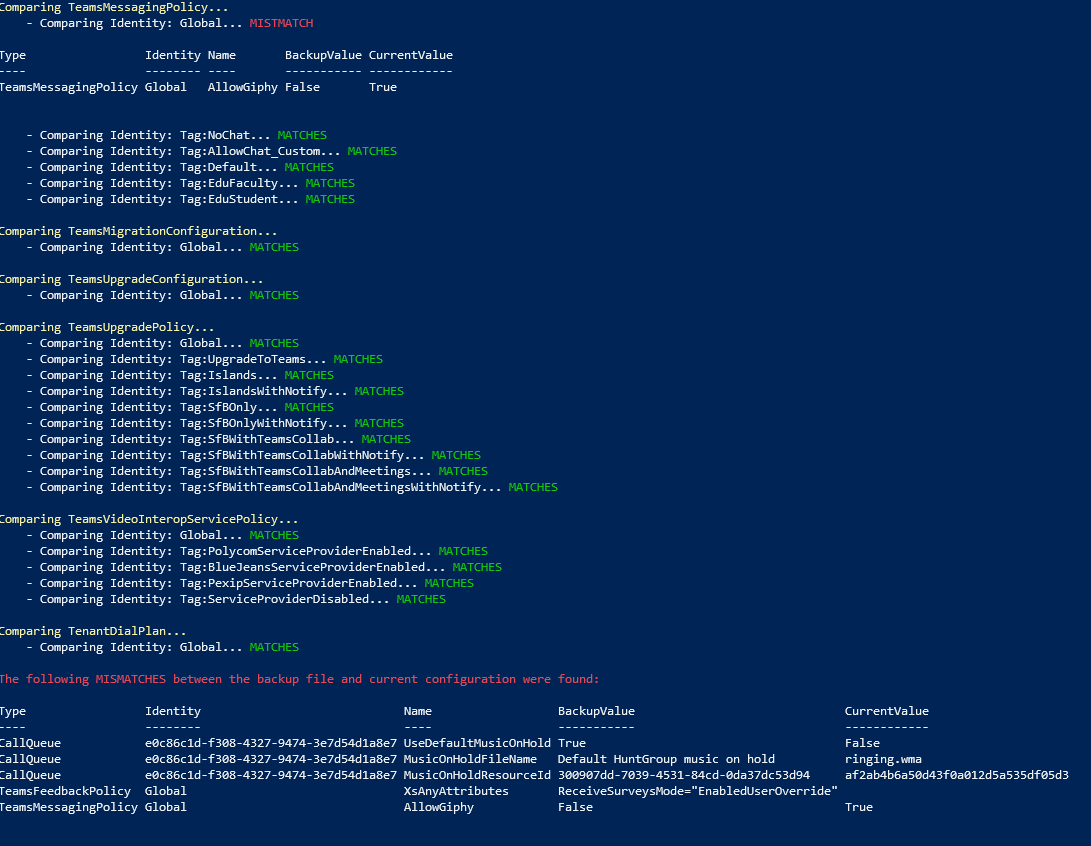 The script will go through each item within the backup and compare it against the existing configuration, noting any mismatches: