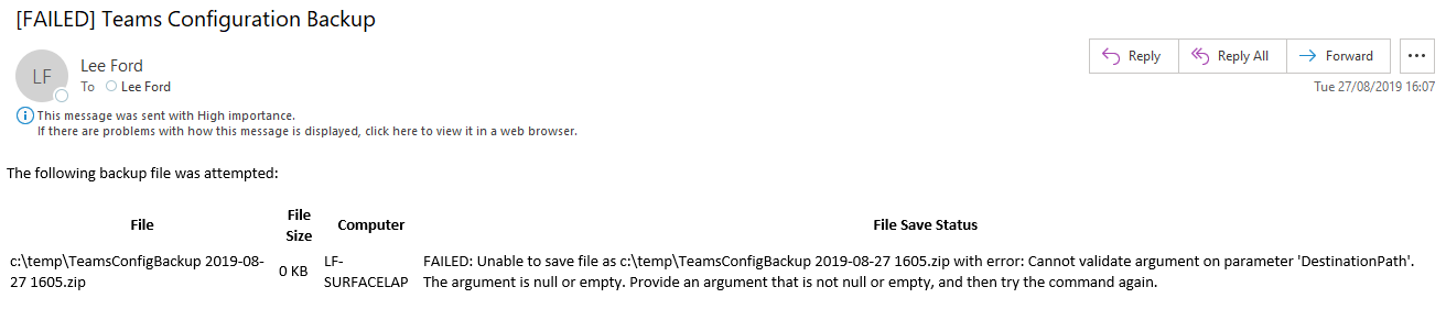 The example Flow "BackupTeamsConfig(Report)Flow.zip" found with the script can be imported in to Flow to illustrate how this can be used (in this case send an email)