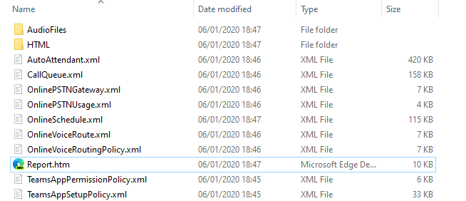 - HTML reports with nested configuration will not show correctly in tables. For example, the "CallFlows" of an Auto Attendant will show as a the string value of the Object "Microsoft.Rtc.Management.Hosted.OAA.Models.CallFlow" rather than the configuration.