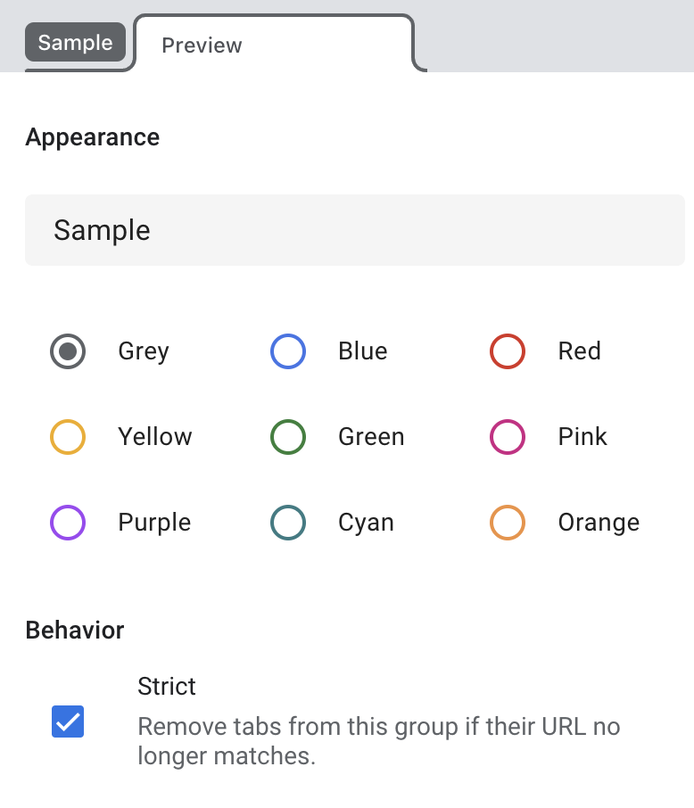 - The tab stays in foo tab group (after a while of randomly browsing, I would find a tab in a group not specified in Auto Group Tabs).