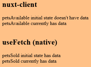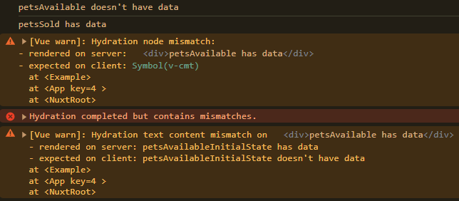 Reproducible example: https://stackblitz.com/edit/nuxt-examples-3jsj37yn?file=components%2Fexample.vue The big thing to look at with that example is:  aaaaand:  Every once in awhile, the initial load on HMR does show that it has...