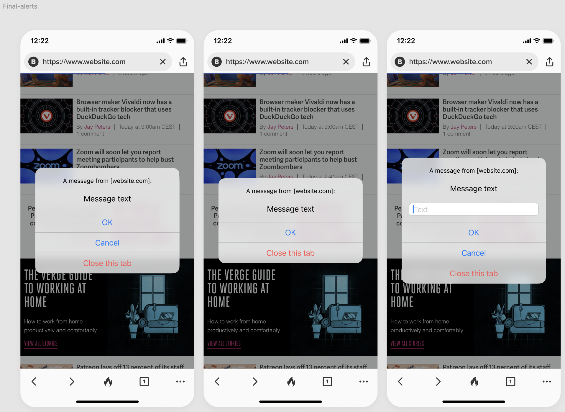 Original designs Implementation https://user-images.githubusercontent.com/365498/179898089-58c71039-70e0-4459-9f5f-29bb5a2b2e0e.mp4 URL for testing: https://www.w3schools.com/jsref/met_win_alert.asp use "prompt" or "confirm" functions instead of "alert" for testing different kinds of alert PR: https://github.com/duckduckgo/iOS/pull/1242