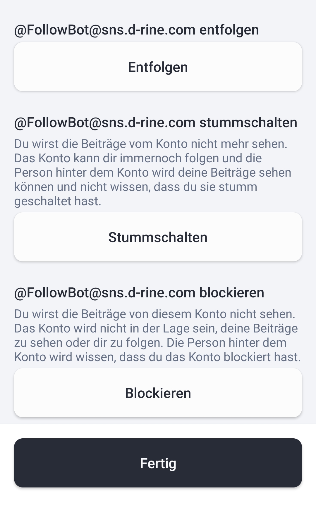 After reporting another user, you're given the option to unfollow, mute or block the profile. However, it's ignored whether you're actually following the profile at all or if you've already muted/blocked it.