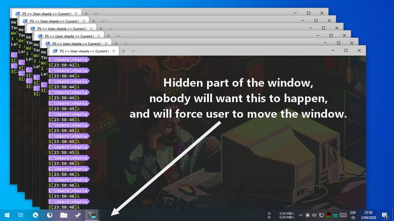 In normal launch: as you can see in the picture above, each new window instance will be positioned in cascade and eventually some instances will show the lower part of the window hidden by the taskbar, making that part invisible when user reaches that area while writing commands, and (normally) the user will be forced to move the window.