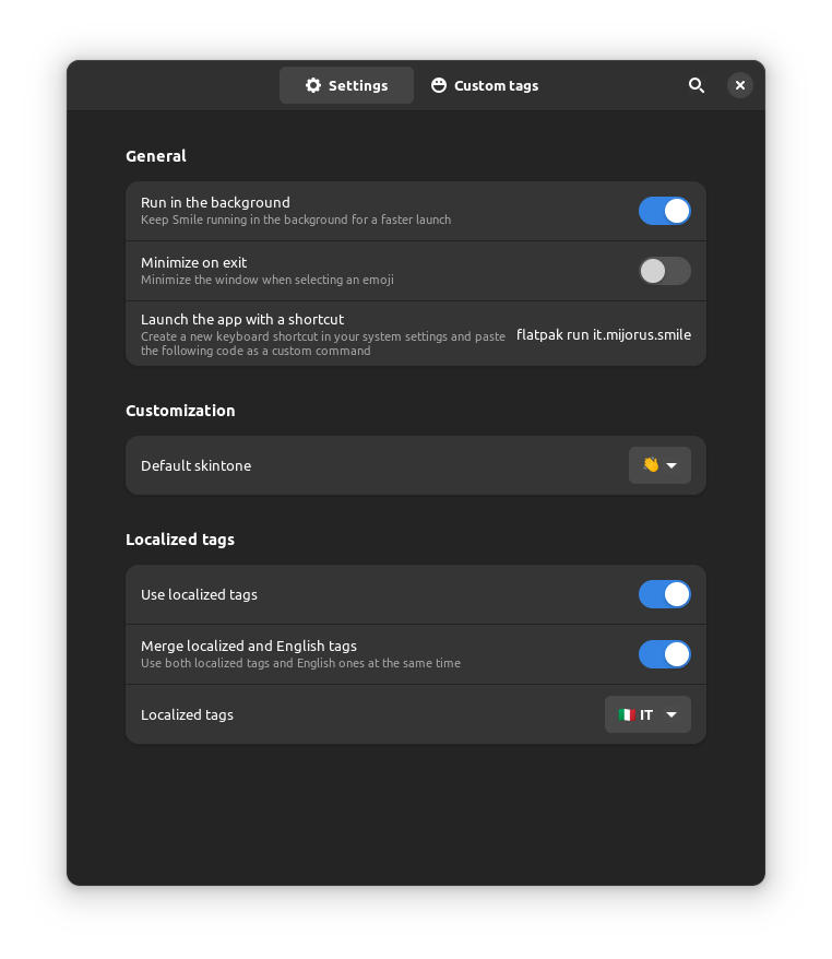 Smile is a simple emoji picker for linux with custom tags support.