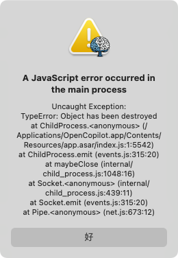 Uncaught Exception: TypeError: Object has been destroyed at ChildProcess.<anonymous> (/Applications/OpenCopilot.app/Contents/Resources/app.asar/index.js:1:5542) at ChildProcess.emit (events.js:315:20) at maybeClose (internal/child_process.js:1048:16) at Socket.<anonymous> (internal/child_process.js:439:11) at Socket.emit (events.js:315:20) at Pipe.<anonymous> (net.js:673:12)