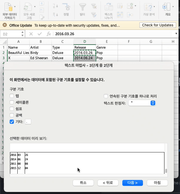 엑셀 다운로드 이후 텍스트나누기 설정 시 엑셀 강제꺼짐 현상