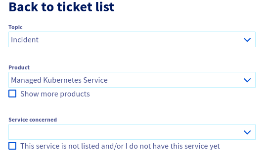 - Continue ticket creation process. The information selected under "service concerned" does not end up in the final ticket and will get asked again by support. (And then the name of the project will be asked) This takes time while there is an incident that could have been spent actually working on the issue.