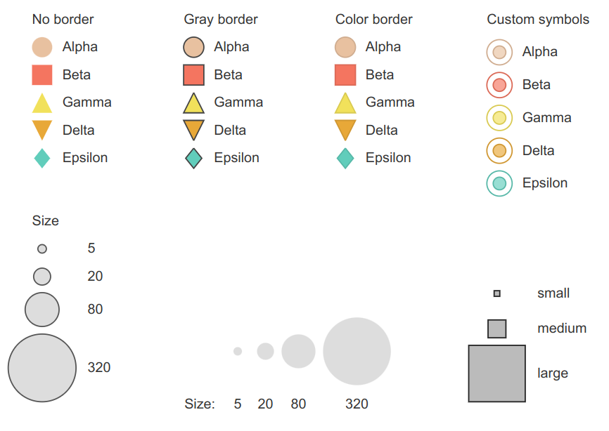 The existing legends package creates basic legends, but lacks capabilities such as displaying multiple symbol types, or symbols of varying sizes. More flexible legends would be particularly relevant to line charts (with points) and scatter charts.